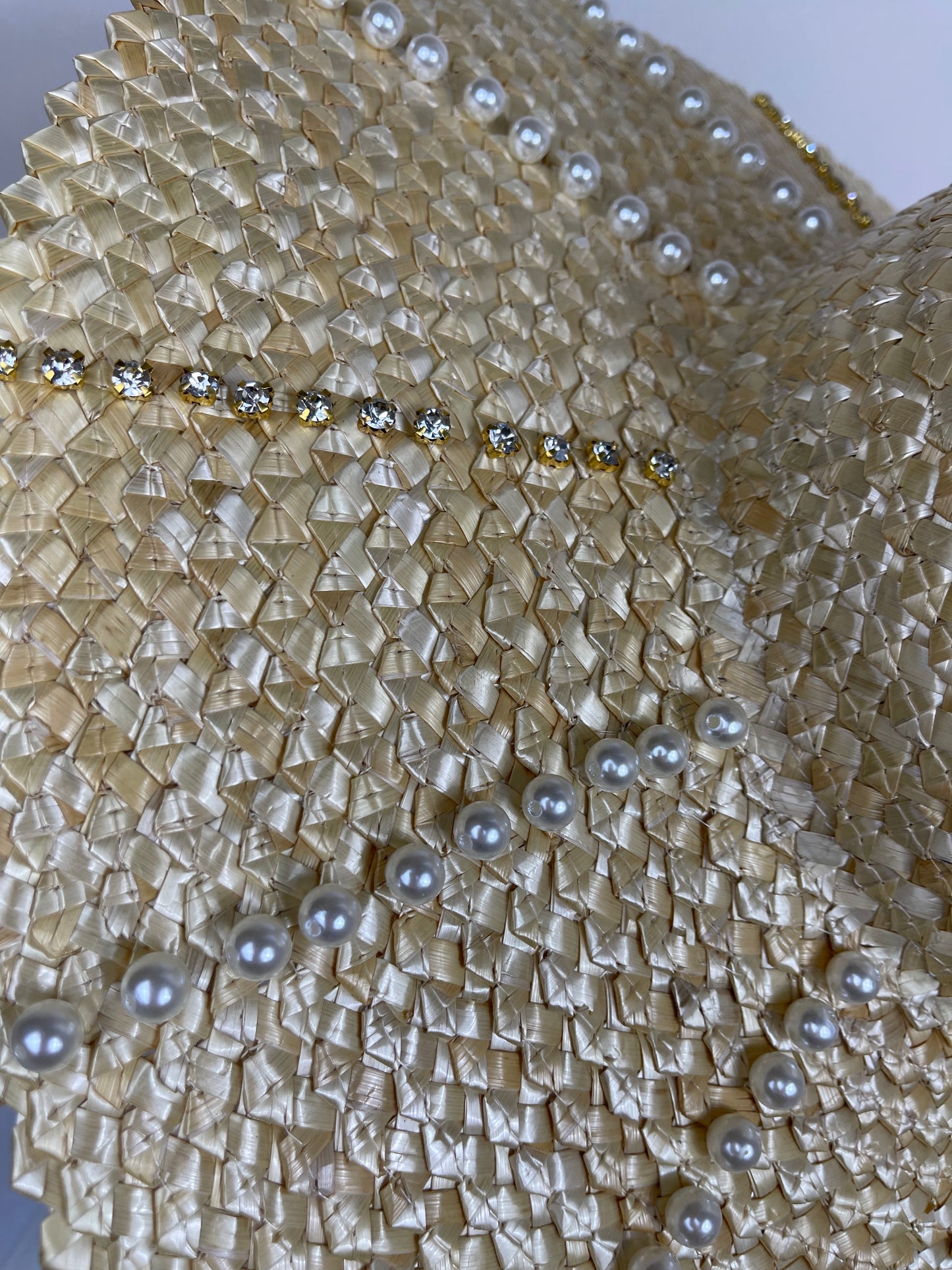 Elevate any summer look with the new in Bardot hat. Seamlessly woven straw provides full sun coverage, while the crystal and pearl embellishments bring a touch of glamour to any outfit. Perfect for summer days.