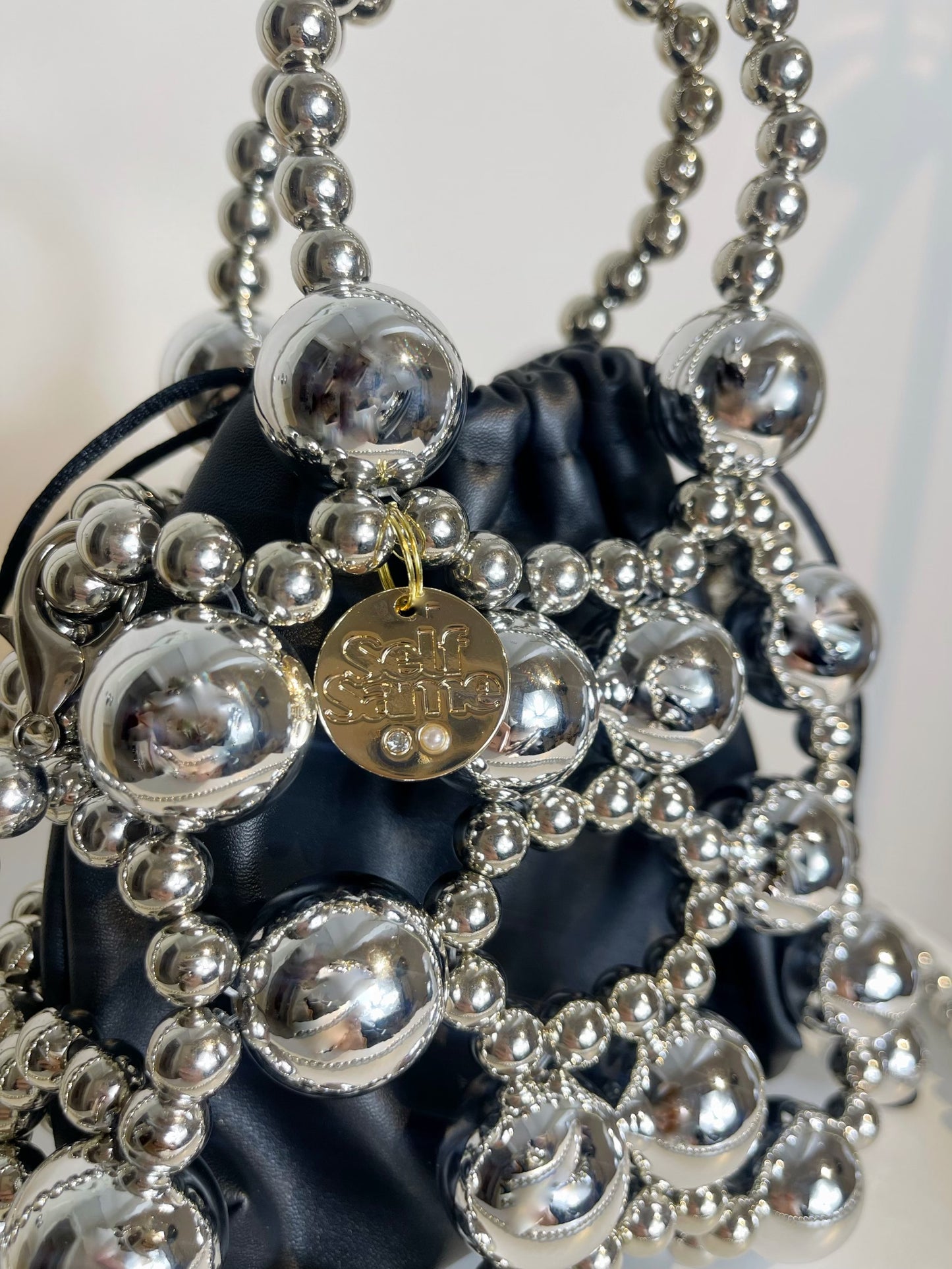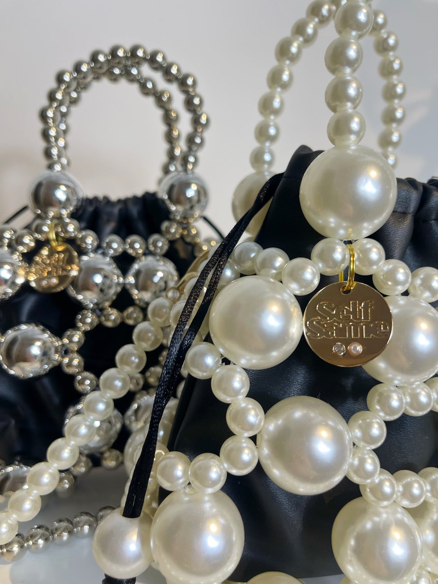 Introducing the Esti Pearl Handbag - a true work of art. This exquisite evening bag features a delicately handcrafted inner pouch, nestled within a mix of lustrous Chrome pearls. The vegan leather inner pouch features a drawstring closure to keep your party essentials secure. Esti also comes with a detachable chrome pearl strap which is ideal for cross body wear. Finished off with Self-Same's embellished logo charm.