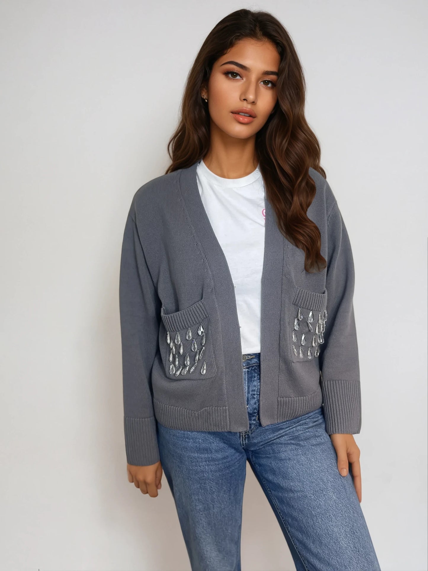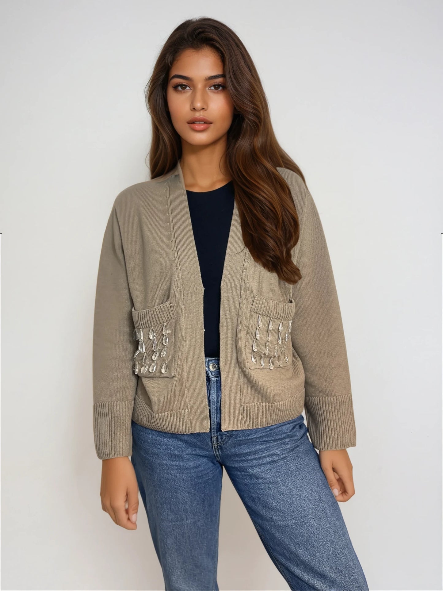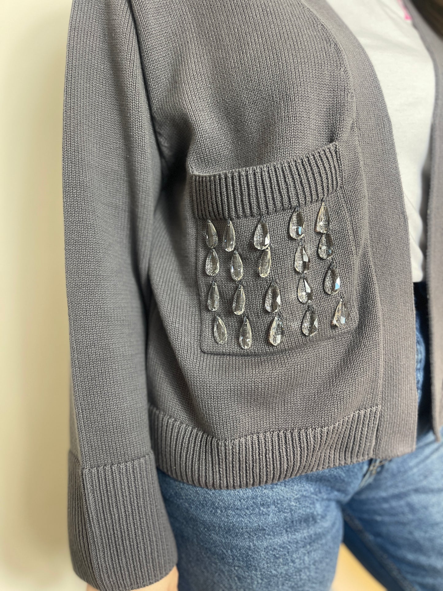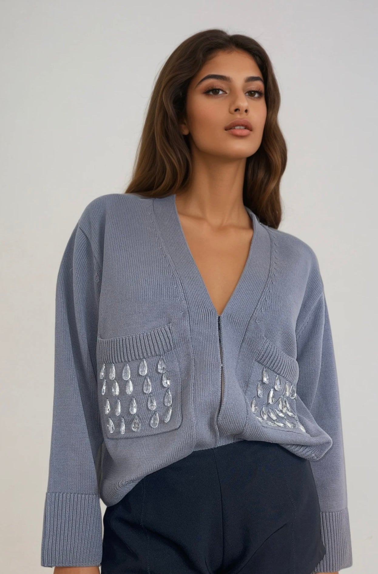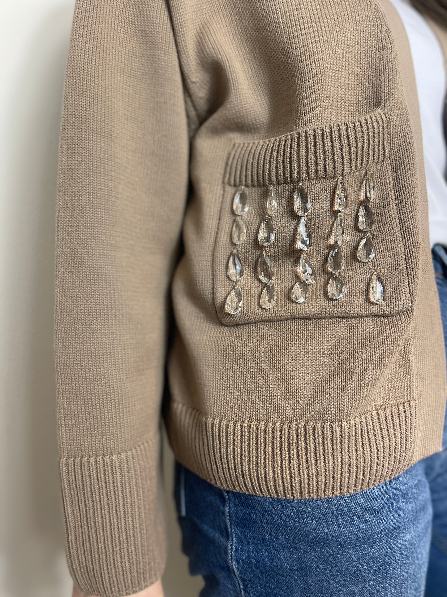 The Mabel Crystal caridgan is the ultimate in relaxed chic luxury. Designed for a relaxed fit, the Mabel features drop shoulders and two oversized centre pockets adorned with luxury teadrop crystals cold to the touch. The mabel features concealed hook and eye closures. Available in two beautiful shades, fawn taupe and grey.