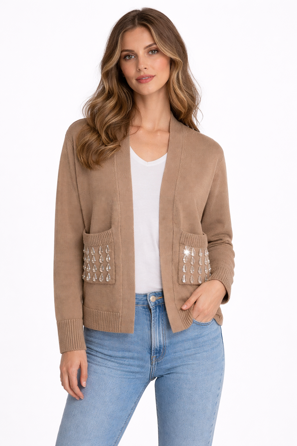 The Mabel Crystal caridgan is the ultimate in relaxed chic luxury. Designed for a relaxed fit, the Mabel features drop shoulders and two oversized centre pockets adorned with luxury teadrop crystals cold to the touch. The mabel features concealed hook and eye closures. Available in two beautiful shades, fawn taupe and grey.